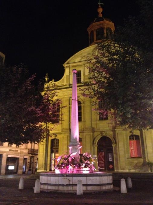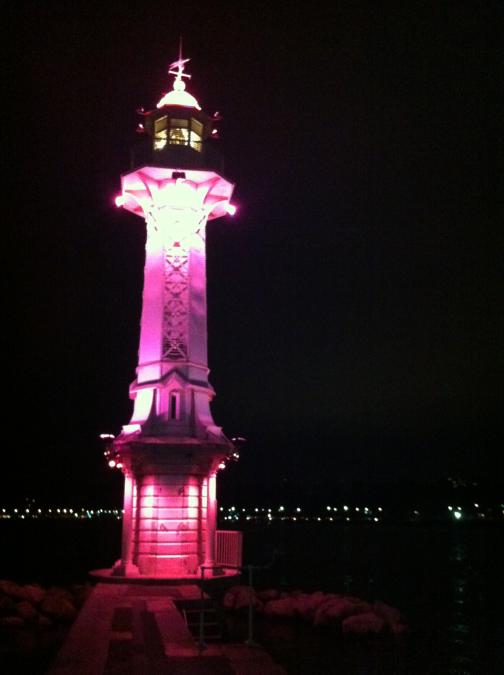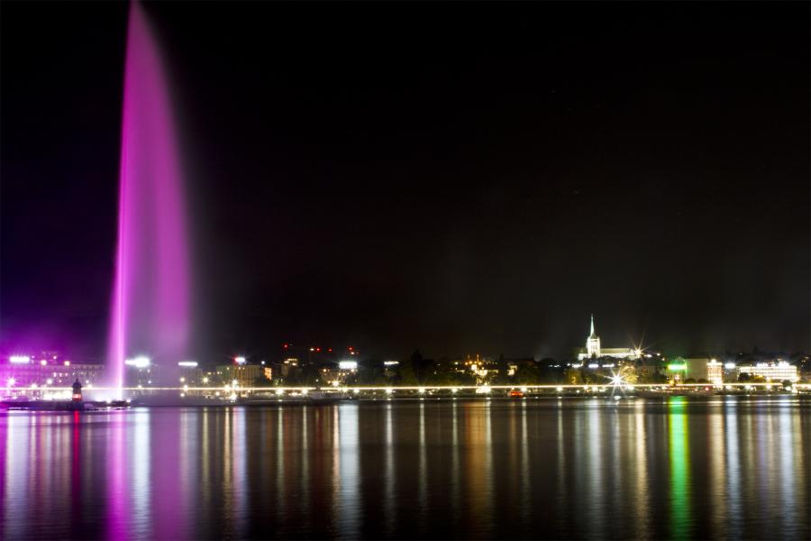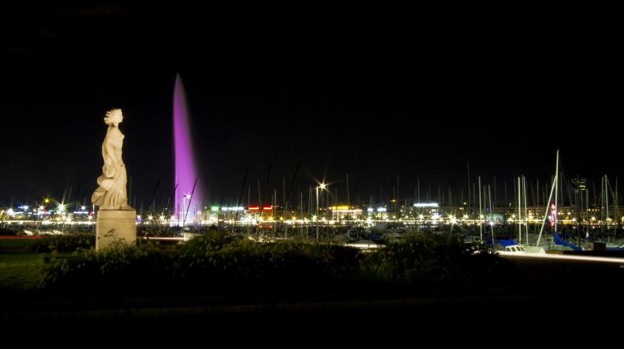 En soirée, illuminations en rose du Phare des Bains des Pâquis et des Fontaines du Molard, de la Fusterie et de la Place Neuve.